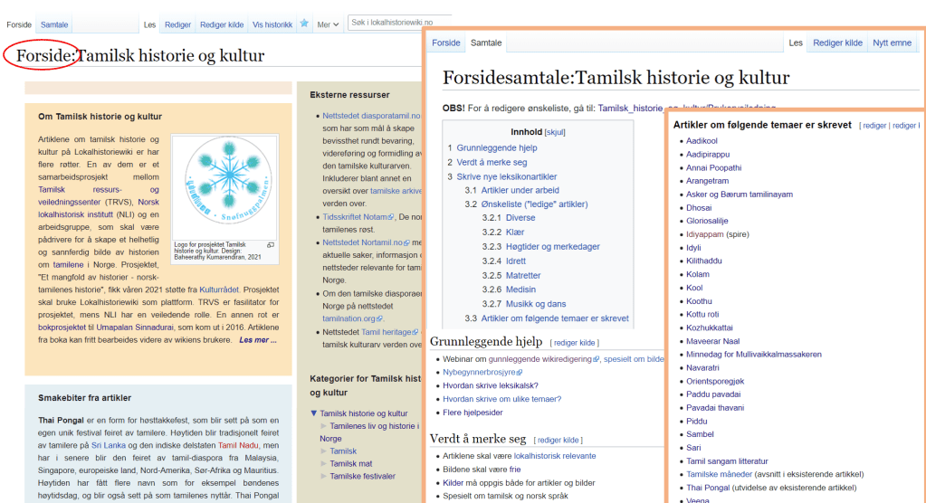 Lokalhistoriewiki.no இல் நடைபெறும் “Et mangfold av historier: norsk-tamilenes historier” செயற்திட்டம் (A diversity of stories: Norwegian-Tamil history; ஒரு பன்முகம் மிக்க கதைகள் – நோர்வேயிய தமிழர்களின் வரலாறு): https://lokalhistoriewiki.no/wiki/Forside:Tamilsk_historie_og_kultur