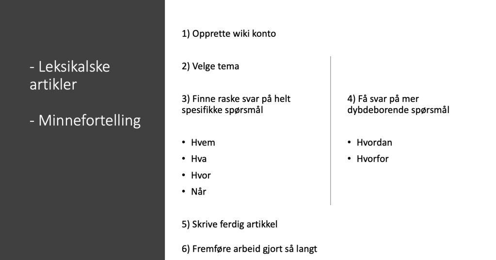- சமூக ஒன்றுகூடலுடனான இயற்பியல் வீக்கிப் பட்டறை. அங்கு கட்டுரைகளை எழுதக் கூடிய எழுத்தாளர்களை சேர்த்தல். நோர்வேயிய மொழியில் எழுதக்கூடிய இளைஞர்களாகவோ அல்லது பெரியவர்களாகவோ இருக்கலாம். (சுமார் 3-4 மணிநேர இயற்பியல் வீக்கிப் பட்டறை)