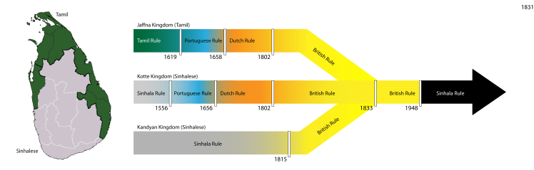 1948ம் ஆண்டு பிரித்தானிய காலனித்துவத்திலிருந்து இலங்கை சுதந்திரமடைந்ததிலிருந்து ஈழத் தமிழர்களின் தாயகம் – தேசியம் – தன்னாட்சி உரிமைக்கான போராட்டம் படிப்படியாக வளர்ந்தது. எனினும், 1833ம் ஆண்டு பிரித்தானியர்கள் மூன்று இராச்சியங்களை ஒரே நாடாக நிறுவிய போதே இப்போராட்டம் அறியாமலேயே எதிர்பார்க்கப்பட்டது. இதுவே தமிழர்களை அவர்களது பூர்வீக மண்ணிலேயே சிறுபான்மை எனும் ஓர் கட்டமைப்பிற்குள் தள்ளியது.