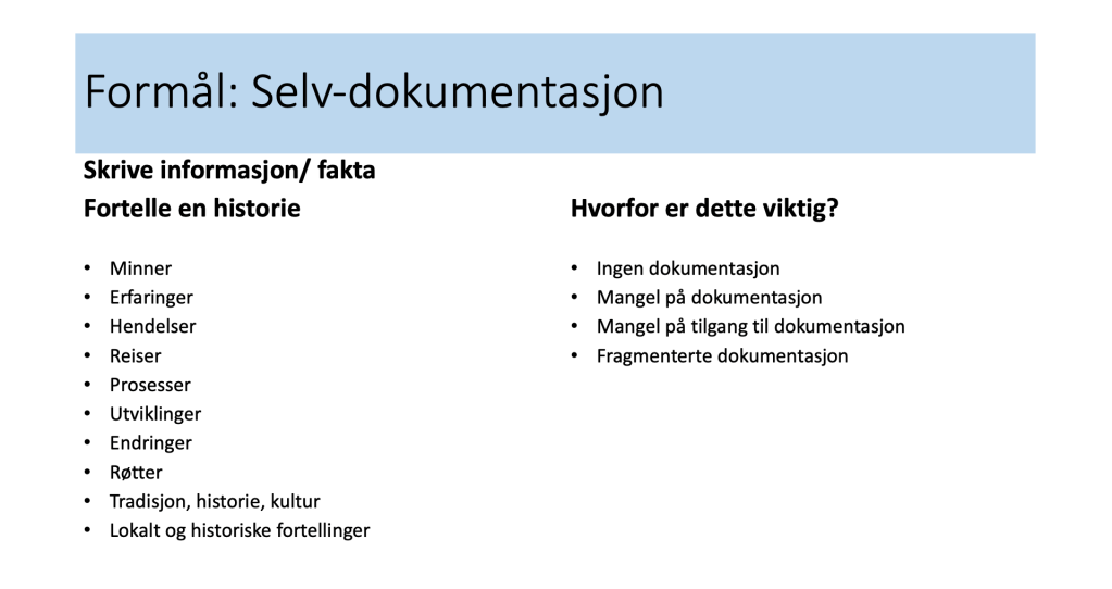 - 18:10 – 20:00: planning and writing encyclopedia articles or memory narratives (minnefortelling).