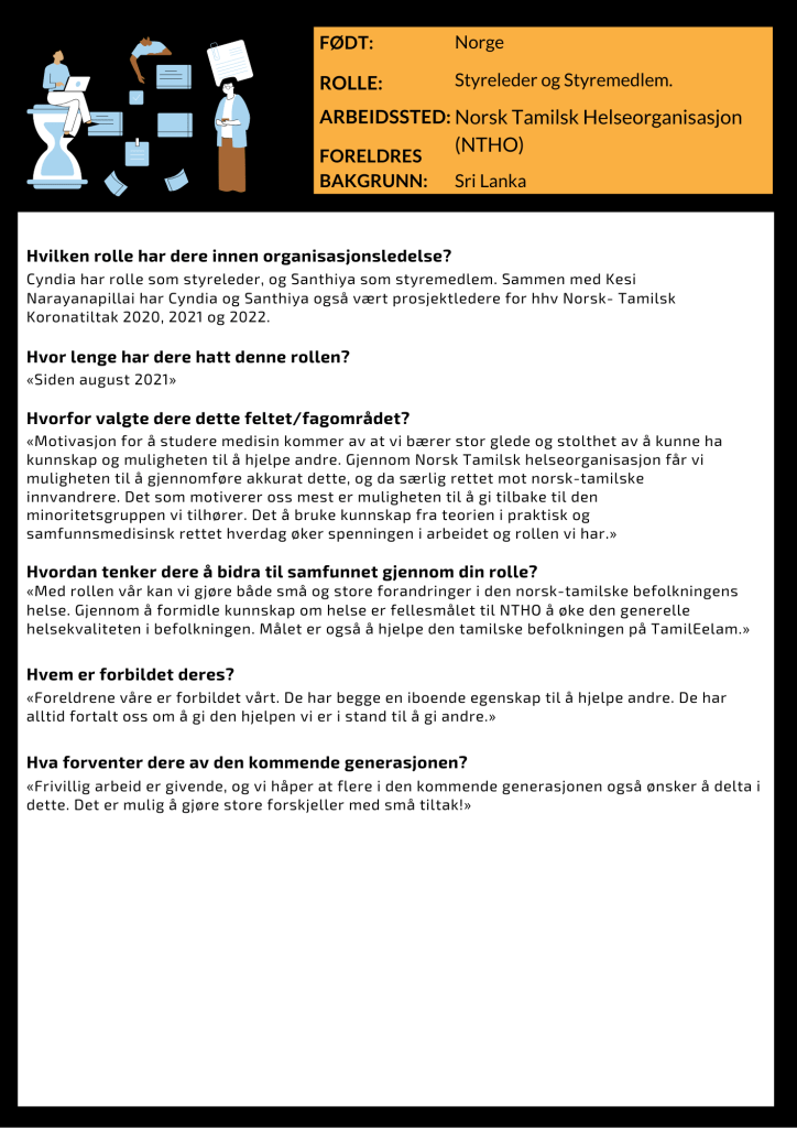 Cyndia har rolle som styreleder, og Santhiya som styremedlem. Sammen med Kesi Narayanapillai har Cyndia og Santhiya også vært prosjektledere for hhv Norsk- Tamilsk Koronatiltak 2020, 2021 og 2022. - Hva er deres arbeidsted innen organisajsonsledelse?