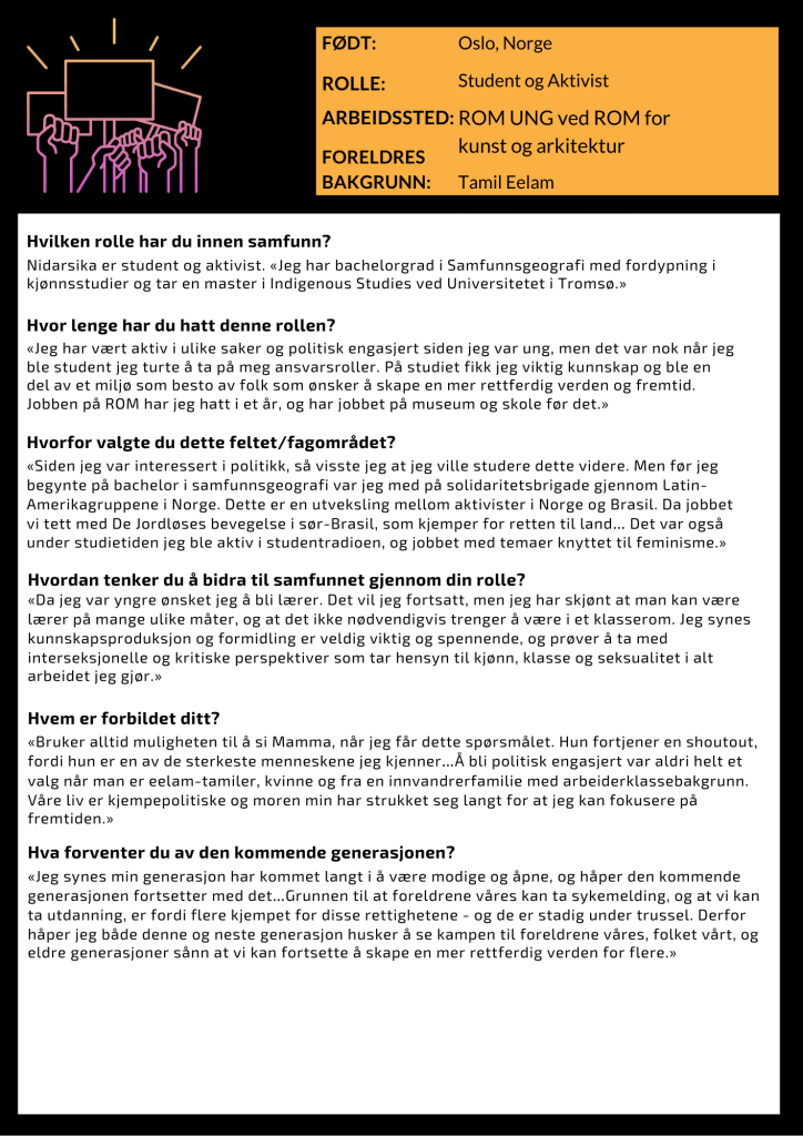 Bruker alltid muligheten til å si Mamma, når jeg får dette spørsmålet. Hun fortjener en shoutout, fordi hun er en av de sterkeste menneskene jeg kjenner. Tamilske kvinner har måttet leve under sterke patriarkalske strukturer, som også har skapt forventninger til hva jeg skal gjøre. Mitt utdanningsvalg og måten jeg jobber på var ukjent for moren min, og var ikke nødvendigvis så fan av at jeg gjorde noe uten om det «vanlige». Men begge har kommet en kjempelang vei når det kommer til å forstå hverandre. Dessuten føler jeg at mye av det jeg gjør er for henne – og vår overlevelse. Å bli politisk engasjert var aldri helt et valg når man er eelam-tamiler, kvinne og fra en innvandrerfamilie med arbeiderklassebakgrunn. Våre liv er kjempepolitiske og moren min har strukket seg langt for at jeg kan fokusere på fremtiden. - Hvordan kan/tenker du bidra til samfunnet gjennom din rolle/ stilling?