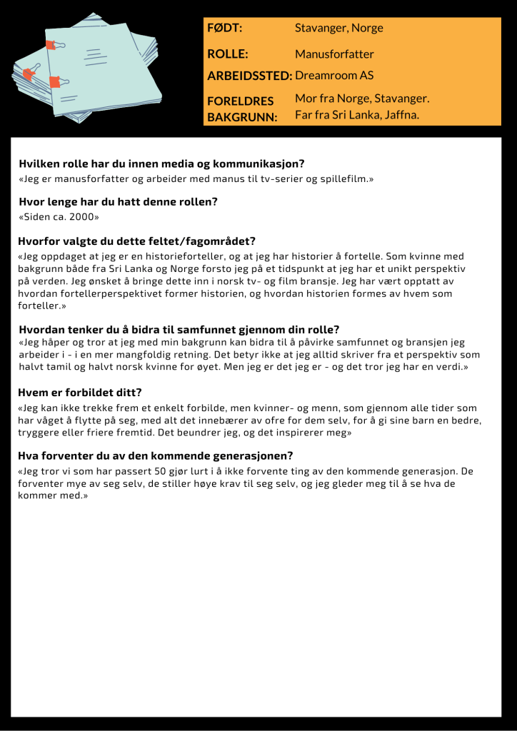 Jeg håper og tror at jeg med min bakgrunn kan bidra til å påvirke samfunnet og bransjen jeg arbeider i – i en mer mangfoldig retning. Det betyr ikke at jeg alltid skriver fra et perspektiv som halvt tamil og halvt norsk kvinne for øyet. Men jeg er det jeg er – og det tror jeg har en verdi.