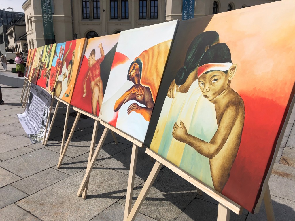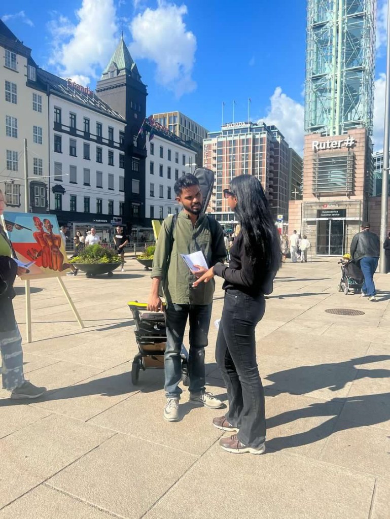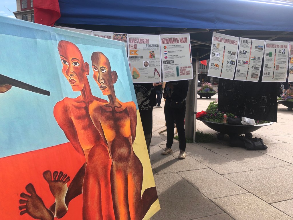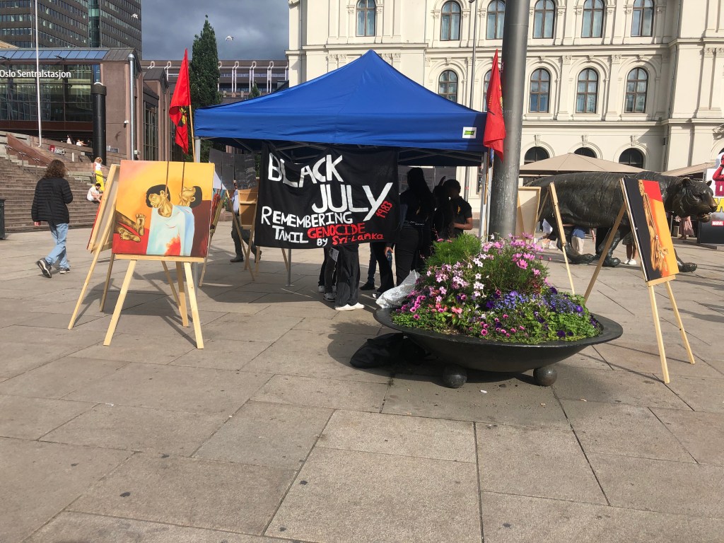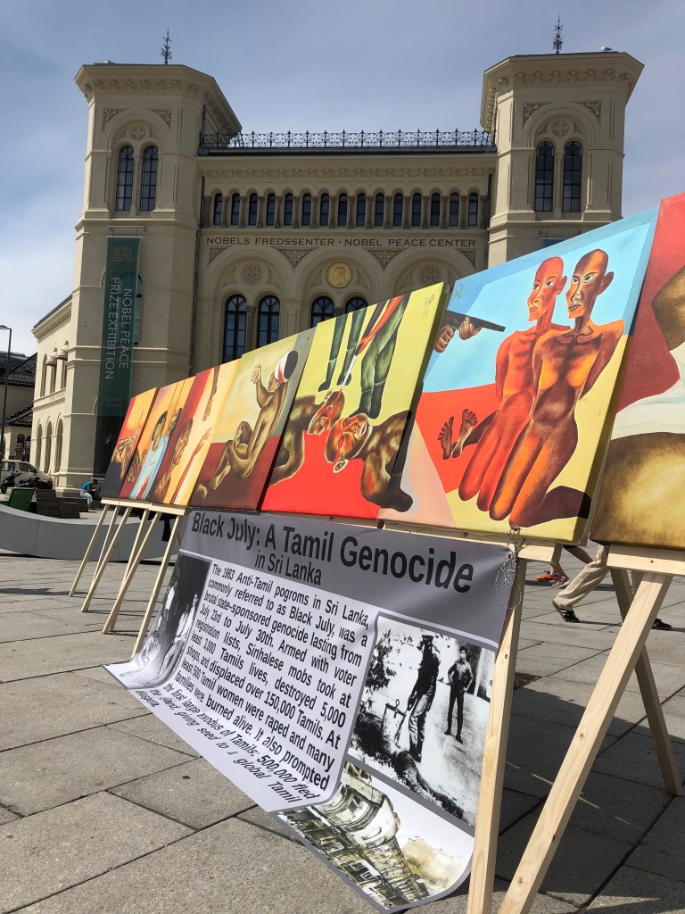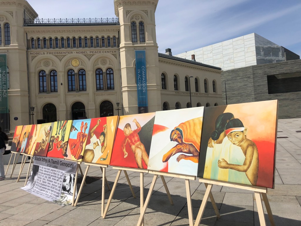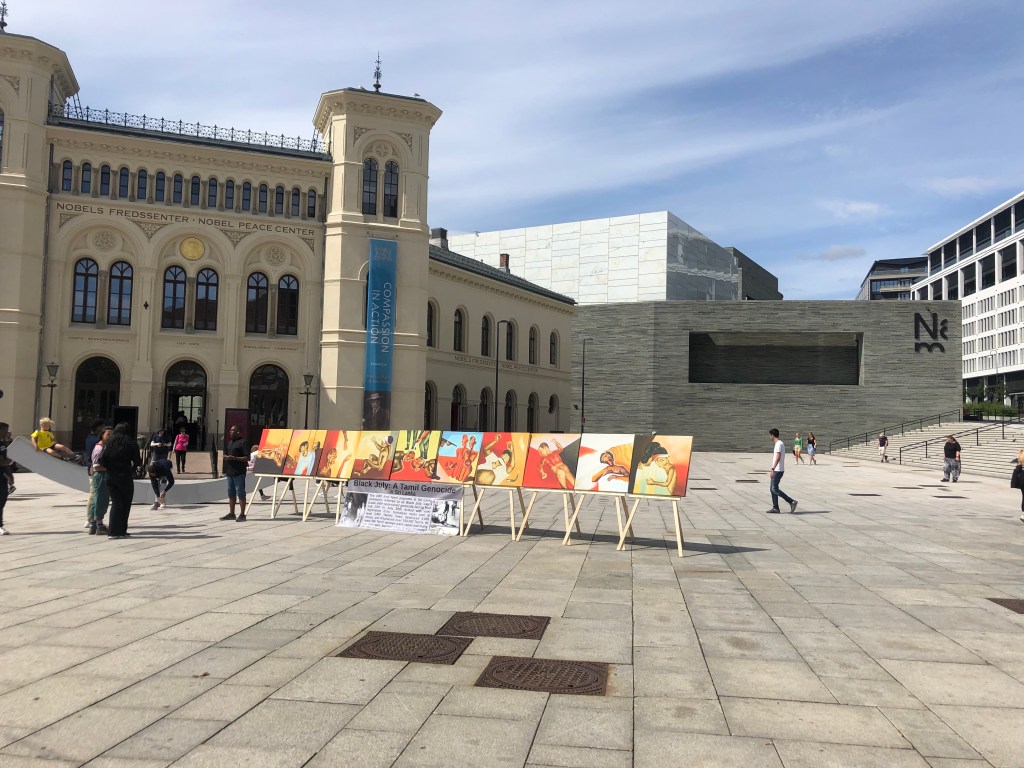 The marking of the 39th anniversary of Black July in Norway took place beside the Nobel Peace Center in Oslo on 23rd July 2022. An art exhibition was organised by Tamil Coordinating Committee – Norway (TCC Norway) and Tamil Youth Organization – Norway (TYO Norway). Paintings by painter Pugazhenthi (ஓவியர் புகழேந்தி).