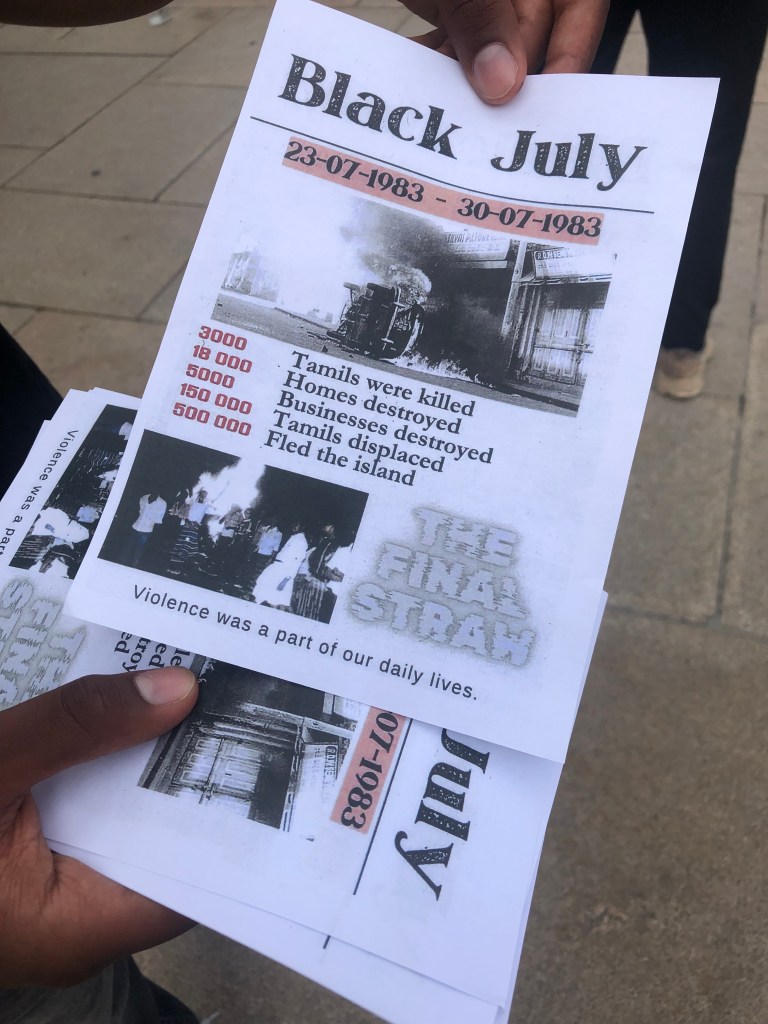 Black July Remembrance Day is a day to mark the anti-Tamil pogrom that lasted from 23rd July to 30th July 1983. It is remembered and marked by Tamils worldwide, including in Norway. It was a state-sponsored genocide. Sinhalese mobs armed with voter registration lists took at least 3,000 Tamil lives, destroyed 5,000 shops and displaced over 150,000 Tamils. At least 500 Tamil women were raped and many families were burned alive.