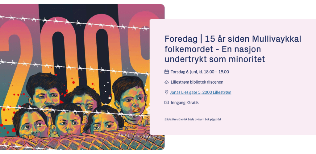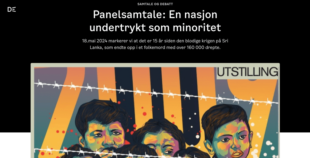 18.05.2024, 14:00 மணி: தமிழ் இனப்படுகொலை நினைவேந்தல் நிகழ்வில் இக்கண்காட்சி வைக்கப்படும். இடம்: Oslo S இல் அமைந்துள்ள Tigerplass.