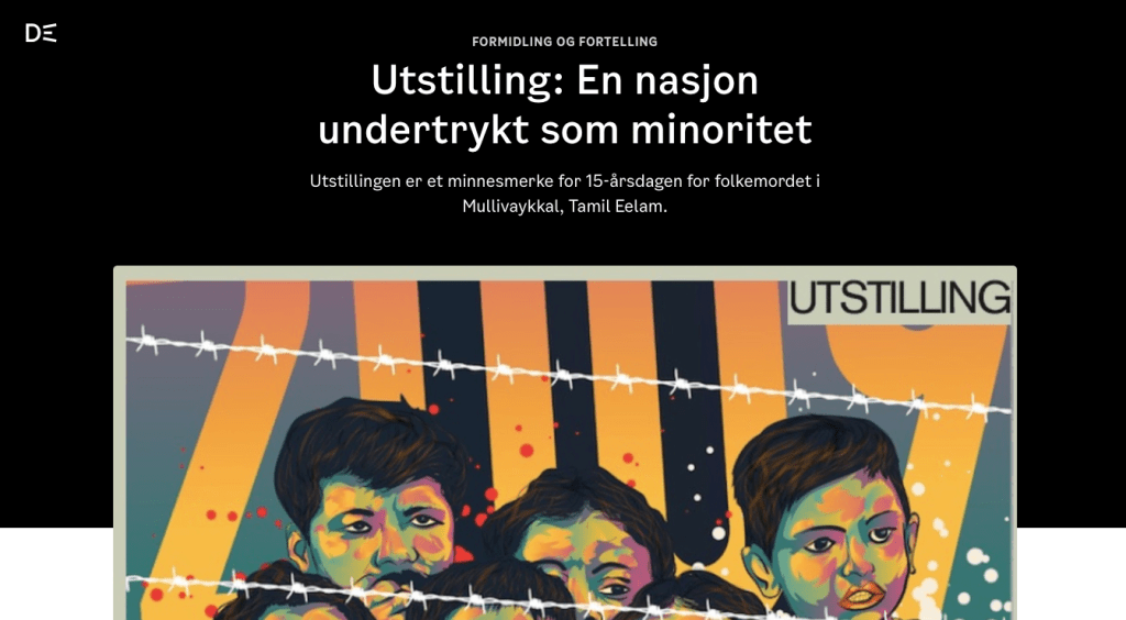 புலம்பெயர் தமிழ் சுவடிகள் காப்பகம் (DTA) மற்றும் தமிழ் இன்சைட் (TI) இணைந்து, “முள்ளிவாய்க்கால்: ஒரு சிறுபான்மை இனமாக ஒடுக்கப்பட்ட ஒரு தேசிய இனம்” என்ற தலைப்பில் ஒழுங்குசெய்யப்படும் கண்காட்சிக்கு உங்களை அழைக்கிறோம். மறைக்கப்பட்ட இனப்படுகொலையான முள்ளிவாய்க்கால் 2009 நினைவையும், நோர்வே வாழ் பல்லினப் பண்பாட்டுச் சமூகத்திற்கு தமிழர்களின் அடக்குமுறை மற்றும் இனப்படுகொலையின் வரலாற்றை உணர்த்தவும் இக்கண்காட்சி ஒழுங்குசெய்யப்பட்டுள்ளது.