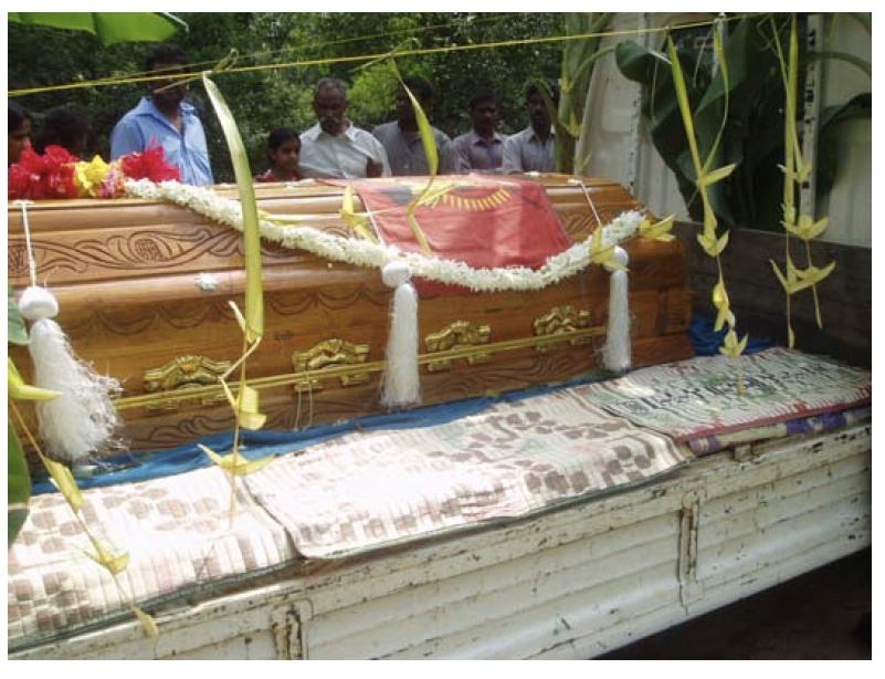 Da vi kom frem til stedet hvor mamma sitt lik lå i kisten satt pappa ved siden av henne. Han var sterkt preget av sin kone, vår kjære mor sin bortgang. Mamma ble hedret med tittelen patriot (நாட்டுப்பற்றாளர்), som ”elsket sitt land”, av ledelsen i Liberation Tigers of Tamil Eelam (LTTE). Hun ble dekket med nasjoanlflagget til Tamil Eelam.